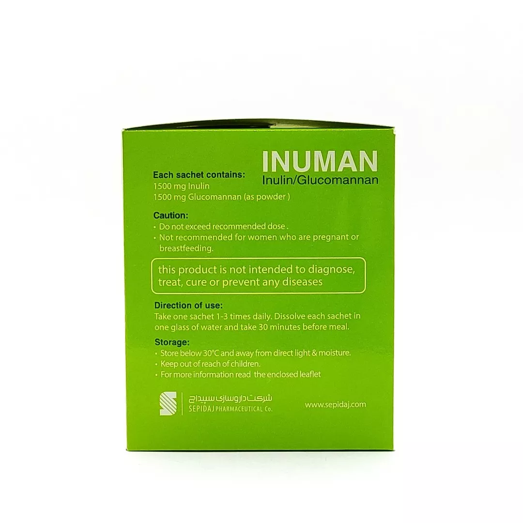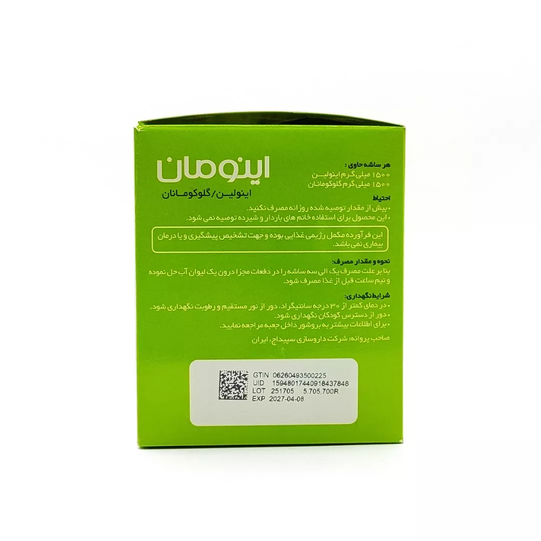 ساشه اینومان سپیداج (Inuman Sepidaj) یک مکمل غذایی بر پایه فیبر رژیمی است که برای سه هدف اصلی طراحی شده است: مدیریت وزن، کنترل قند و چربی خون، و بهبود یبوست. این محصول راهحلی طبیعی برای افرادی است که با مشکل اضافه وزن یا اختلالات متابولیک دستوپنجه نرم میکنند.