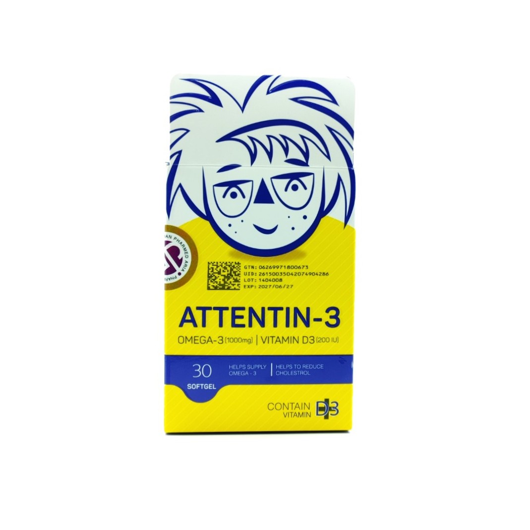 سافت ژل اتنتین ۳ (Atten-Tin) از شرکت جهان فارمد آریا، یک مکمل غذایی تخصصی است که برای کمک به بهبود تمرکز، توجه و کاهش علائم بیشفعالی، به ویژه در کودکان و نوجوانان، طراحی شده است. این محصول با فرمولاسیون مبتنی بر اسیدهای چرب امگا-۳، یک راهکار طبیعی و ایمن برای حمایت از عملکرد بهینه مغز و سیستم عصبی ارائه میدهد.