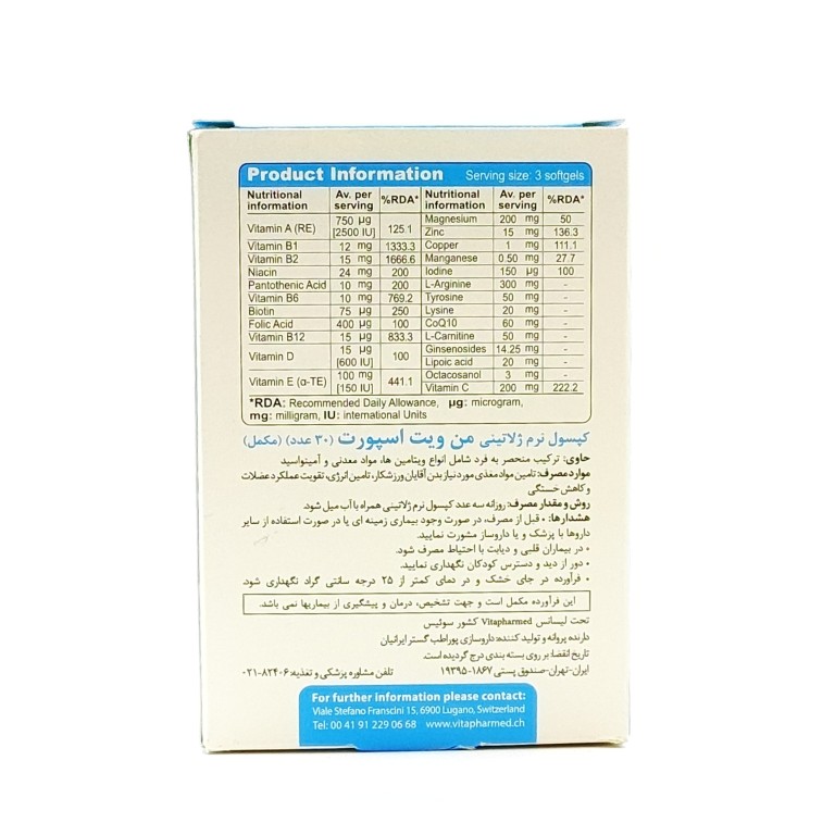 با سافت ژل من ویت اسپورت ویواتیون، سطح انرژی خود را بالا نگه دارید و عملکرد ورزشی خود را به حداکثر برسانید. این مولتی ویتامین تخصصی، فرمولی کامل برای مردان فعال و ورزشکاری است که به دنبال تقویت قوای جسمی، ذهنی و ریکاوری سریعتر هستند.