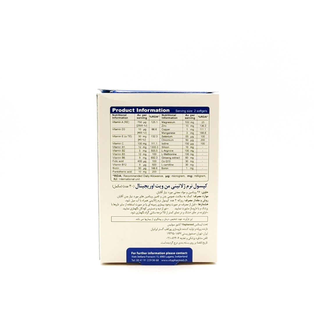 سافت ژل من ویت اورجینال ویواتیون یک مولتیویتامین مینرال کامل است که دقیقاً بر اساس نیازهای بیولوژیکی آقایان فرموله شده است. این محصول با تامین ریزمغذیهای ضروری، انرژی روزانه شما را افزایش داده و سلامت عمومی بدنتان را تضمین میکند.