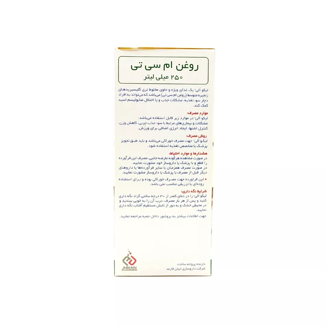 شربت لیکو الی ابیان فارمد (Liqo Oli) یک مکمل تخصصی حاوی روغن MCT (تریگلیسیرید با زنجیره متوسط) خالص است. این محصول به عنوان یک منبع سوخت پاک و سریع برای بدن عمل میکند. بدن شما این چربیهای سالم را به سرعت به انرژی تبدیل میکند و از آنها برای افزایش متابولیسم و حمایت از رژیمهای کاهش وزن استفاده مینماید.