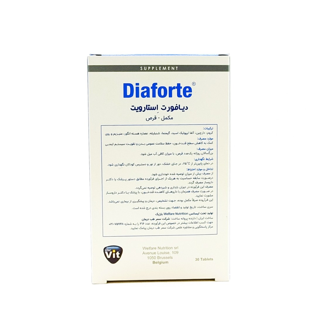مدیریت دیابت تنها به مصرف دارو محدود نمیشود؛ بدن شما به حمایت تغذیهای ویژهای نیاز دارد. قرص دیافورت استار ویت یک مولتیویتامین تخصصی و کامل برای بیماران دیابتی و پیشدیابتی است. این محصول با فرمولاسیون دقیق خود، نیاز بدن به ویتامینها و مواد معدنی را تأمین کرده و به تنظیم سطح گلوکز خون کمک میکند. ما استفاده از دیافورت را برای جلوگیری از عوارض شایع دیابت مانند خستگی مزمن، مشکلات بینایی و آسیبهای عصبی پیشنهاد میکنیم. با مصرف این مکمل، انرژی از دست رفته را بازیابید و کیفیت زندگی خود را ارتقا دهید.