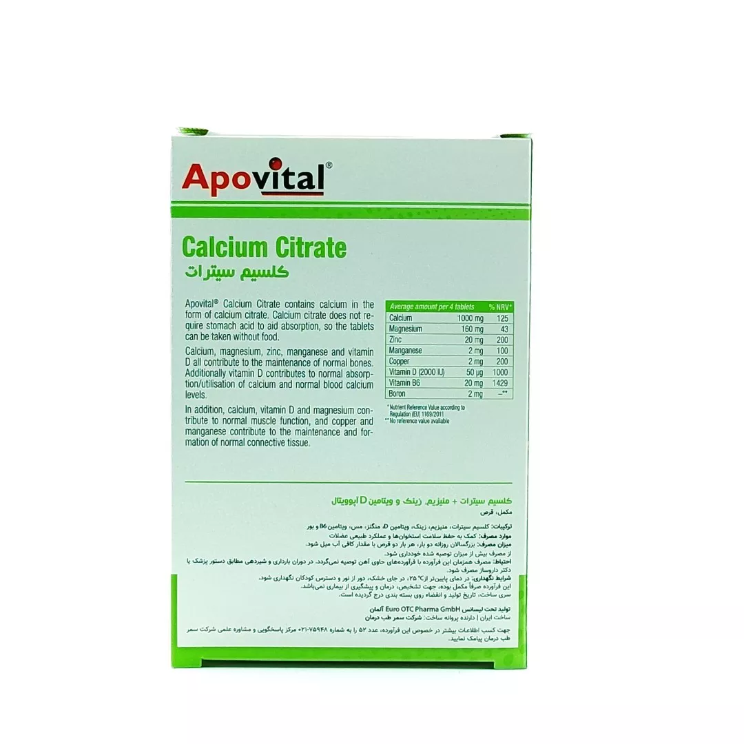 این محصول از برند معتبر آپوویتال، یک مکمل غذایی جامع برای حفظ و تقویت توده استخوانی است. وجه تمایز اصلی این فرآورده، استفاده از ملح “کلسیم سیترات” است که نسبت به فرم کربنات، جذب بسیار بالاتری دارد و عوارض گوارشی کمتری ایجاد میکند. حضور همزمان منیزیم، زینک و ویتامین D در کنار کلسیم، عملکردی همافزا داشته و تضمین میکند که کلسیم مصرفی به طور موثر جذب و در بافت استخوانی به کار گرفته شود.
