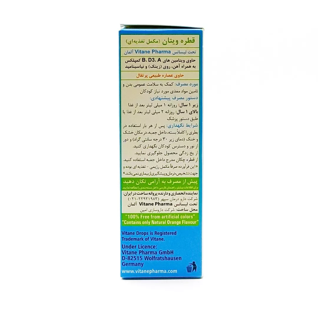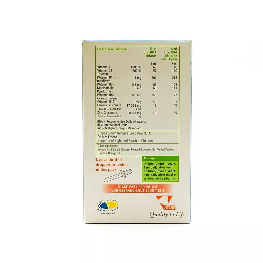 قطره مولتی ویتامین ویتان (Vitane Multivitamin Drops) یک مکمل جامع و ضروری برای نوزادان و کودکان است. این محصول باکیفیت (تحت لیسانس آلمان) طیف کاملی از ویتامینهای مورد نیاز برای رشد سالم، تقویت سیستم ایمنی و بهبود اشتهای کودک را فراهم میکند.