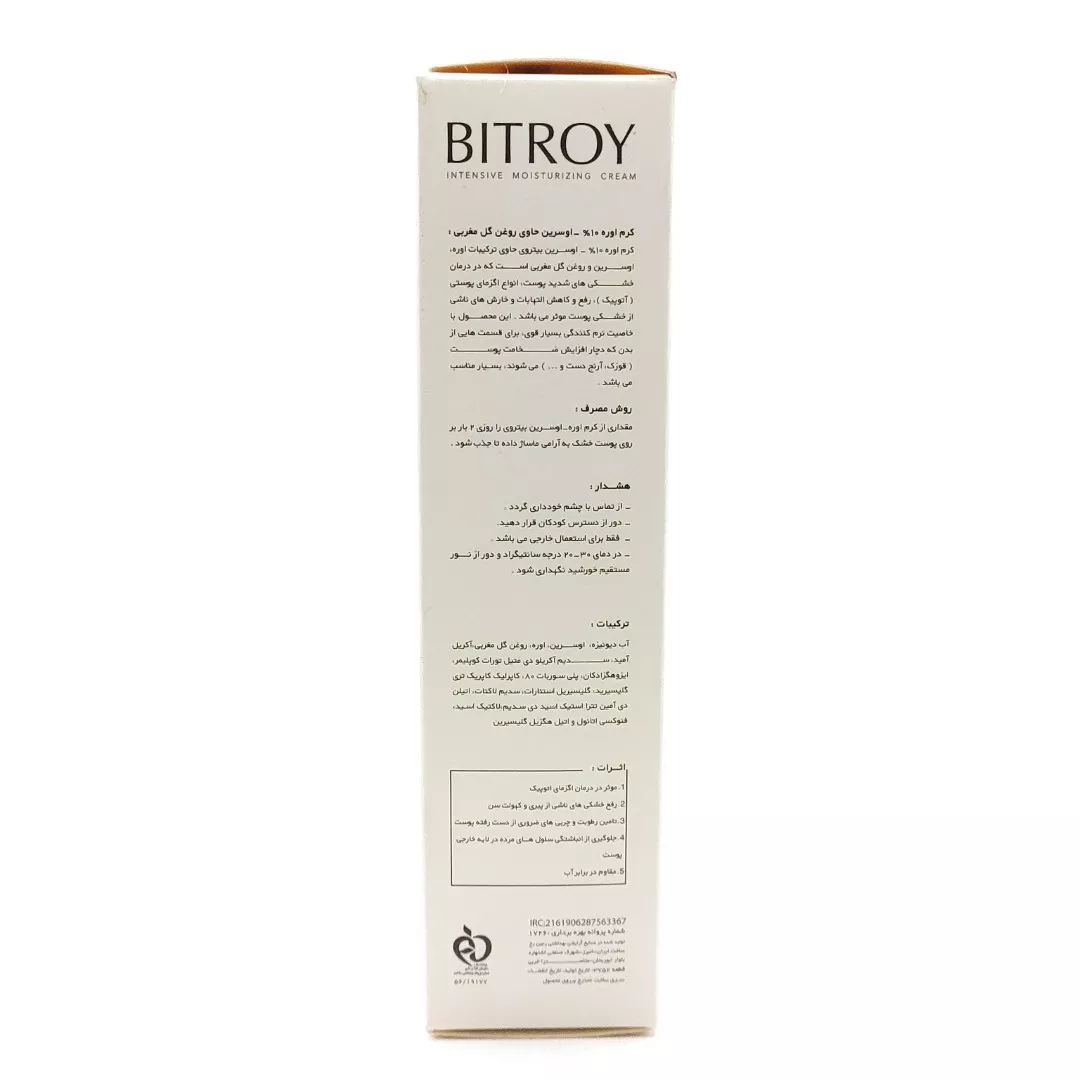 کرم اوره اوسرین ۱۰ درصد بیتروی یک محصول درمانی قوی برای رفع خشکی‌های مزمن است. فرمولاسیون این کرم بر پایه دو ماده طلایی “اوره” و “اوسرین” بنا شده است. اوره سلول‌های مرده را لایه‌برداری می‌کند و اوسرین یک سد چربی محافظ روی پوست می‌سازد. علاوه بر این، وجود روغن گیاهی گل مغربی در این محصول، التهابات پوستی را به شدت کاهش می‌دهد. این کرم زبری آرنج، زانو و قوزک پا را کاملاً برطرف می‌کند.
