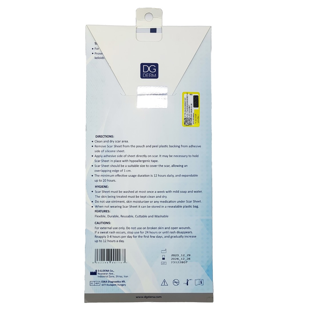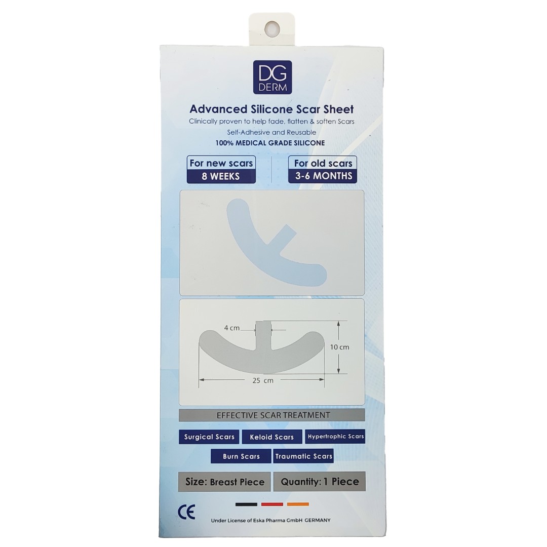 نوار سیلیکونی زیر سینه DG Derm یک ورق سیلیکونی ۱۰۰٪ گرید پزشکی است که برای کمک به کاهش قرمزی، برجستگی و خارش اسکارهای جراحی سینه طراحی شده است. این قطعه با فرم هلالی، دقیقاً چین زیر سینه را میپوشاند و با ایجاد محیط مرطوب و بسته (Occlusive) روی پوست، به تنظیم تولید کلاژن و نرم و صافتر شدن ظاهر اسکار کمک میکند.