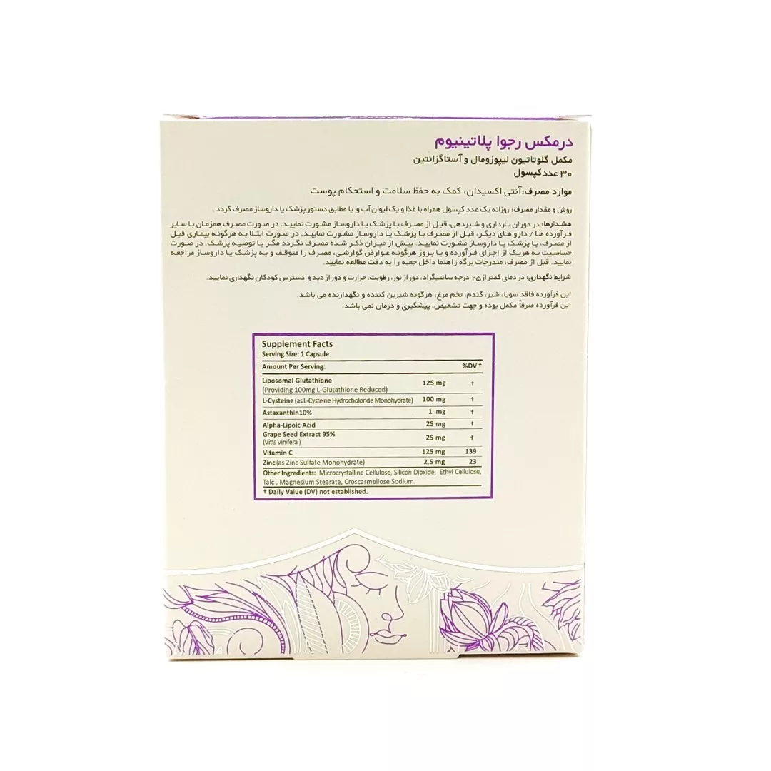 کپسول رجوا پلاتینیوم درمکس یک مکمل غذایی پیشرفته برای سلامت و زیبایی پوست است. این محصول با هدف مقابله با چین و چروک، خشکی و افتادگی پوست طراحی شده است. فرمولاسیون آن با تامین مواد مغذی ضروری، به تقویت ساختار کلاژن و الاستین پوست از درون کمک می‌کند. مصرف منظم این کپسول، پوستی صاف، درخشان و مستحکم را برای شما به ارمغان می‌آورد و از آن در برابر آسیب‌های محیطی محافظت می‌کند.