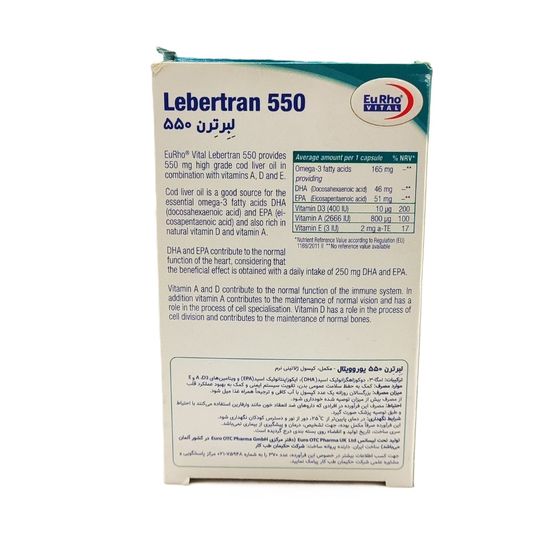 خرید کپسول لبرترن ۵۵۰ یوروویتال (Eurho Vital Lebertran) راهکاری طبیعی و موثر برای تامین نیازهای اساسی بدن است. این مکمل که حاوی روغن کبد ماهی است، با فرمولاسیون غنی خود، سلامت عمومی شما را تضمین میکند.