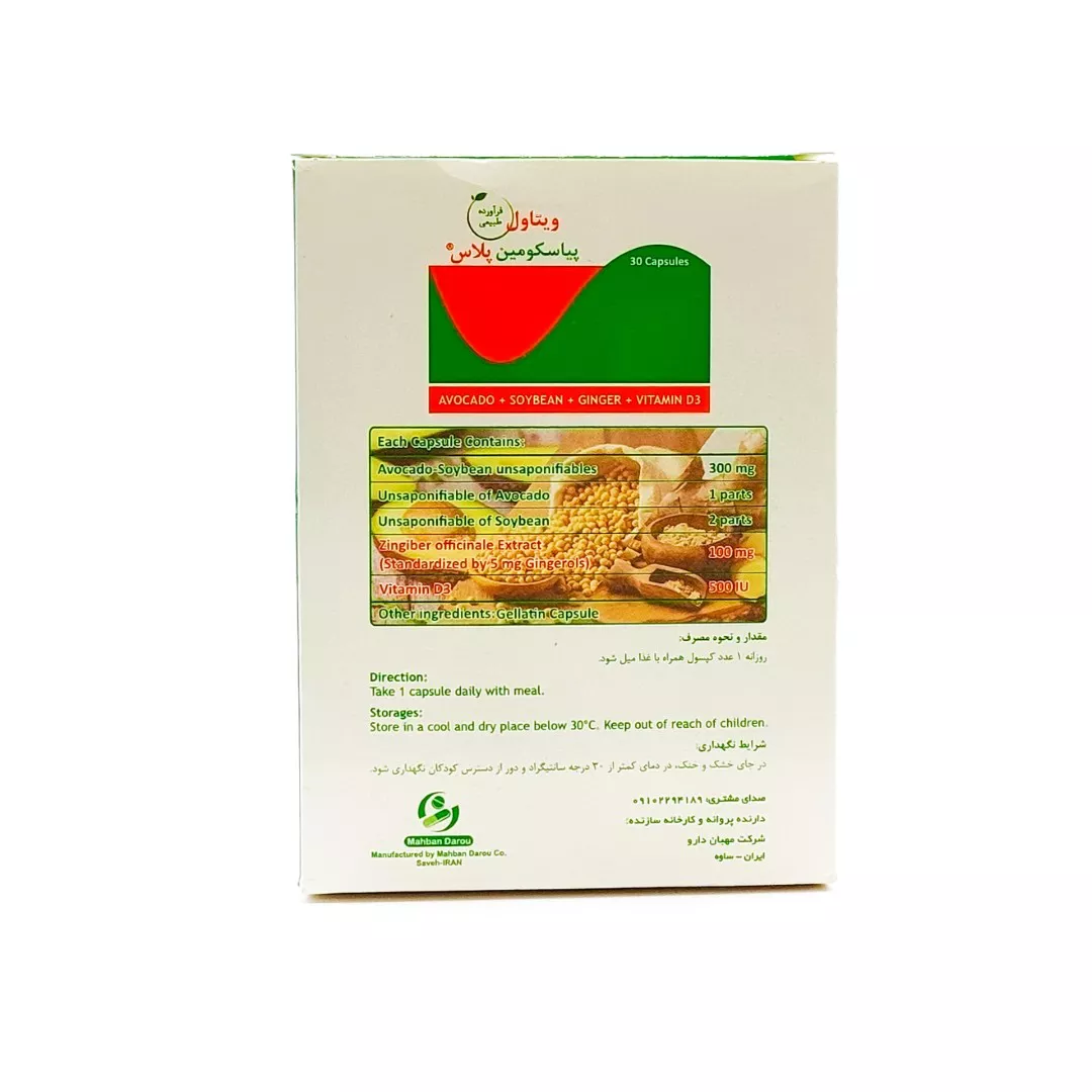 کپسول پیاسکومین پلاس ویتاول یک مکمل قدرتمند و گیاهی برای درمان التهاب و درد مفاصل است. شما با خرید کپسول پیاسکومین پلاس ویتاول، از ترکیب جادویی آووکادو، سویا و زردچوبه بهرهمند میشوید. این محصول به طور تخصصی برای بازسازی غضروفها و بهبود حرکت مفاصل طراحی شده است.